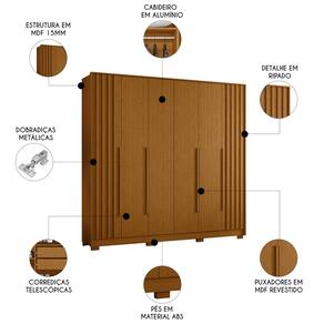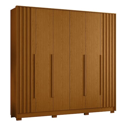 Com seis portas de dobradiças metálicas, o design permite uma abertura suave e duradoura. As portas laterais apresentam um belo detalhe ripado, que acrescenta um toque de modernidade e estilo ao Guarda Roupa 6 Portas, tornando-o um destaque no seu quarto ou closet. As quatro gavetas, equipadas com corrediças telescópicas, permitem um deslizamento perfeito, facilitando o acesso aos itens menores como roupas íntimas, acessórios e objetos pessoais. Os puxadores de MDF revestidos acrescentam um acabamento elegante, complementando o visual refinado. O design inteligente também inclui dois cabideiros em alumínio, ideais para pendurar suas roupas com praticidade e eficiência. Com moldura de 15mm, o Guarda Roupa oferece uma base robusta e estável, garantindo durabilidade e resistência. Os pés inclusos conferem um toque de leveza ao design, além de facilitarem a limpeza.