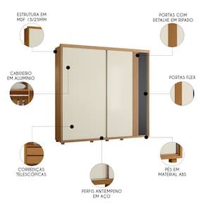 Com duas portas deslizantes de cor flex, o design inovador permite um deslizamento suave e sem esforço, proporcionando fácil acesso ao interior. As quatro gavetas, equipadas com corrediças telescópicas, oferecem maior durabilidade e facilidade de uso, permitindo o armazenamento de roupas e acessórios de forma eficiente. Os puxadores perfil em alumínio agregam um toque sofisticado, complementando o visual clean e contemporâneo do móvel. A estrutura do Guarda Roupa 2 Portas é reforçada por perfis antiempeno em aço, garantindo robustez e resistência, enquanto o aplique de MDF revestido oferece um acabamento de alta qualidade. As prateleiras internas proporcionam um amplo espaço de organização. Além disso, os dois cabideiros de alumínio oferecem um suporte ideal para pendurar suas roupas com praticidade. Com moldura de 25mm, o Guarda Roupa oferece estabilidade e resistência, tornando-se uma peça durável para o seu ambiente. Os pés inclusos não só asseguram maior durabilidade, como também facilitam a limpeza, mantendo o móvel elevado e dando um toque de leveza ao design.