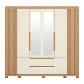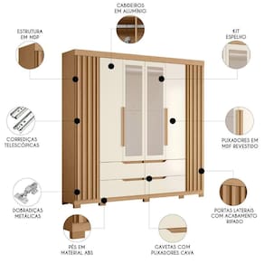 Esse Guarda Roupa Casal foi projetado com as portas laterais com detalhe ripado, que adicionam um toque de charme e estilo ao ambiente. Já as 4 gavetas espaçosas possuem puxadores estilo cava, proporcionando um visual moderno e sofisticado. Além disso, as corrediças telescópicas garantem um deslizamento suave e sem ruídos. Na parte interna, com os cabideiros em alumínio, você terá amplo espaço para pendurar suas roupas sem se preocupar com amassados, as diversas prateleiras são uma ótima opção para roupas que podem dobrar ou até mesmo para dispor calçados e bolsas. Outro detalhe são os pés, que oferecem estabilidade e durabilidade ao móvel, além de facilitar a limpeza do ambiente. Para completar, o espelho é perfeito para você conferir seu visual antes de sair, além de contribuir para a sensação de profundidade no ambiente.