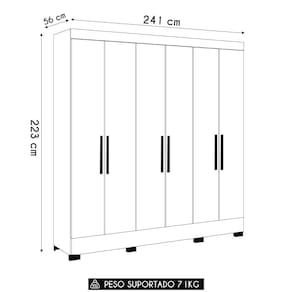 Produzido 100% em MDF de 12/15mm e com um design moderno que se adapta perfeitamente a diferentes estilos de decoração, esse Guarda Roupa um elemento essencial para manter o quarto sempre organizado e elegante. São seis portas convencionais equipadas com dobradiças metálicas, ele oferece fácil acesso e durabilidade. As quatro gavetas internas possuem corrediças metálicas telescópicas, garantindo um deslizamento suave e silencioso. Além disso, os cabideiros metálicos proporcionam um suporte robusto para suas roupas, mantendo tudo organizado e acessível. Os puxadores do Guarda Roupa 6 Portas são em MDF adicionam um toque de sofisticação ao móvel, enquanto os pés de uso opcional oferecem versatilidade e proteção contra umidade. Este guarda-roupa é ideal para quem busca um móvel espaçoso e prático, que alia beleza e funcionalidade.