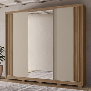 As duas portas laterais possuem puxadores ripados em MDF, um detalhe contemporâneo que dá charme e requinte à peça, enquanto à porta central conta com um espelho amplo, agregando sofisticação ao Quarto Casal. Com acabamento de alto padrão, esse Roupeiro se destaca pela beleza e solidez, tornando-se um móvel durável e visualmente impactante.