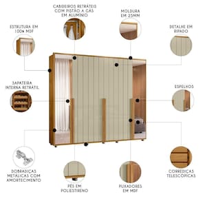 O grande diferencial desta peça está nas quatro sapateiras deslizantes com corrediças telescópicas, que oferecem organização adicional e fácil visualização dos calçados. As seis gavetas também com corrediças telescópicas garantem funcionalidade no dia a dia. Os pés em poliestireno asseguram estabilidade à estrutura. O guarda roupa se destaca pelo espaço generoso e pela elegância, ideal para o Quarto de Casal ou solteiro.