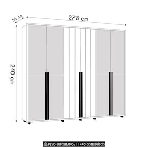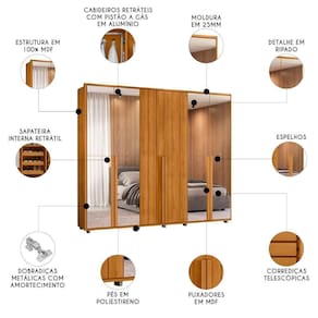 As seis portas com abertura convencional do Guarda Roupa contam com dobradiças metálicas com sistema de amortecimento, oferecendo mais suavidade e durabilidade no uso diário. Quatro das seis portas possuem espelho, adicionando um toque de sofisticação e funcionalidade. Além disso, as prateleiras internas e puxadores em MDF, reforçam a estética moderna e clean.