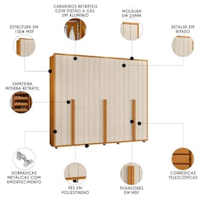 O grande diferencial desta peça está nas quatro sapateiras deslizantes com corrediças telescópicas, que oferecem organização adicional e fácil visualização dos calçados. As seis gavetas também com corrediças telescópicas garantem funcionalidade no dia a dia. Os pés em poliestireno asseguram estabilidade à estrutura. O guarda roupa se destaca pelo espaço generoso e pela elegância, ideal para o Quarto de Casal ou solteiro.