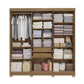 Acabamento: Pintura Brilho / Pintura Touch | Acabamento da Fita Borda: Papel | Cor: Nogueira/Macadâmia | Corrediças: Metálicas | Garantia: 3 meses para defeito de fabricação | Gavetas: Internas | Matéria-prima: MDP / Polipropileno | Peso suportado por cabideiro: 10 Kg | Peso suportado por cada prateleira: 7 kg | Puxadores: Alumínio | Quantidade de calceiros: 2 | Quantidade de gavetas: 2 | Quantidade de portas: 3 | Quantidade de prateleiras: 9 | Sistema de montagem: Parafuso Philips / Parafuso Philips e Minifix | Tipo de porta: Correr