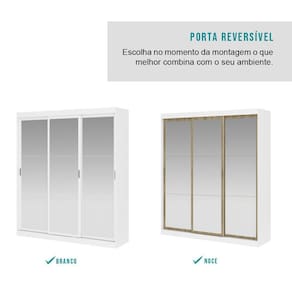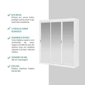 O Guarda-Roupa Mega Carraro é uma peça ótima para organizar e manter seu ambiente estilo. Conta com 3 portas com amplos espelhos, sendo elas reversíveis, podendo escolher o melhor acabamento na hora da montagem. Ele comporta tudo que precisa sema preocupação de falta de espaço. A peça possui grande espeaço decabideiros e gavetas, nichoslateraiscom diversas prateleiras internas, é possível armazenar roupas, acessórios e calçados, deixando tudo à mão e trazendo muita praticidade para o seu dia a dia.