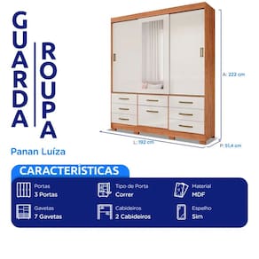 Características: Marca: Panan Modelo: Luiza Tipo: Casal Tipo de porta: Correr Quantidade de portas: 3 portas Quantidade de gavetas: 7 gavetas Quantidade de cabideiros: 2 cabideiros Sapateira: Sim Espelho: Sim Tamanho do espelho: 119,2X45 cm Espessura do espelho: 3 mm Gaveta com chave: Não Tipo de roldanas: Metálicas Tipo de corrediças: Telescópicas Material da estrutura: MDF Material dos puxadores: MDF Pés: Sim Material dos pés: ABS Acabamento: Pintura UV Escala de brilho: Fosco Sistema de montagem: Minefix, parafusos e cavilhas