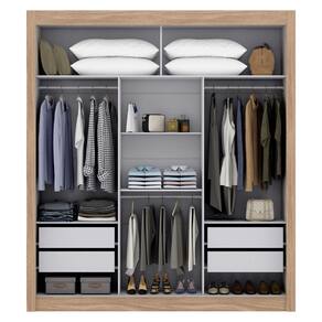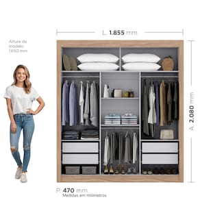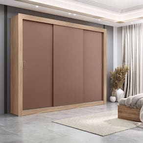 Características: 3 Portas de correr com sistema de roldanas com regulagem Corrediças telescópicas 2 Cabideiros em madeira 1 Calceiro em madeira 4 Gavetas Espaço para sapatos Espaço interno com divisória para ela-ele Estrutura em MDP Cada prateleira suporta peso de até 6kg Cada gaveta suporta peso de até 4kg