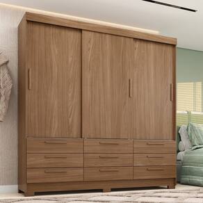 Caracteristicas Estrutura: MDP 12mm Acabamento: Pintura UV Quantidade e Tipo de Portas: 3 de correr Tipo de Dobradicas/Trilhos: Dobradicas Metalicas Simples Quantidade de Gavetas: 9 Tipo de Corredicas: Telescopicas Tipo de Puxadores: MDF revestido Quantidade e Tipo de Cabideiros: 2 em Aluminio Quantidade de Prateleiras: 4 Suporte ate: 8kg na prateleira e 3kg por gaveta. Manutencao: Nao limpar com alcool ou qualquer outro produto quimico, utilize somente pano seco ou levemente umedecido. Sistema de Montagem: Cavilhas, Parafusos e Minifix Itens Inclusos: 1 Guarda-Roupa, Kit ferragens e Manual de montagem Garantia de Fabrica: 3 meses