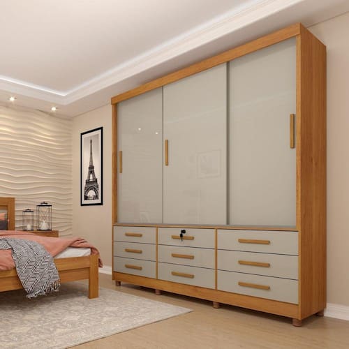 O guarda roupa Chicago possui um design inovador, com material de alta qualidade com cores incríveis. Guarda Roupa em MDP, com corrediças telescópicas, 9 gavetas externas, trilho inferior em alumínio, cabideiros em alumínio, puxadores em PVC. Deixando o ambiente mais harmonioso e lindo. Acabamento da Prateleira: Pintura Escala de Brilho da Prateleira: Brilhante Possui Cabideiros: 02 Acabamento da Gaveta: Pintura Escala de Brilho da Gaveta: Brilhante Possui Organizador de Gaveta: Não Acabamento da Porta: Pintura Escala de Brilho da Porta: Fosco Material do Puxador da Porta: PVC Altura dos Pés: 6 cm Ambiente Principal: Quarto Complexidade da Montagem: Alta: deve ser montado por um montador especializado Cor: Cinamomo/Off White Cor do Produto: Cinamomo/Off White Escala de Brilho: Semi-Brilho Gaveta com Chave: Não Itens Inclusos: 1 Guarda Roupa, Kit Ferragens e Manual de Montagem. Linha ou Coleção: Chicago Manual de Montagem e Instalação: https://cdn2.madeiramadeira.com.br/atributo/tcil-moveis/430684-esquema-de-montagem-roupeiro-3-portas-chicago.pdf Material da Gaveta: MDP Material da Porta: MDP Material da Prateleira: MDP Material dos Pés: PVC Material Principal: MDP Necessita Montagem: Sim Origem do Produto: Nacional Peso: 149,24 kg Peso Máximo por Gaveta: 10 kg Peso Máximo por Prateleira: 10 kg Possui Calceiros: 01 Possui Espelho: Não Possui Pés: 08 Possui Portas: 03 Possui Prateleiras: 04 Recomendações de Uso, Manutenção e Limpeza: Não colocar o produto em lugar úmido, não arrastar, limpar somente com pano macio e seco, não expor o produto a incidência de luz solar, não colocar peso superior ao indicado. Sapatas Niveladoras: Não Sistema de Montagem: Parafusos, Cavilhas e Pregos. Tipo de Corrediça da Gaveta: Metálica Telescópica Tipo de Dobradiça/Corrediça da Porta: Metálica Tipo de Gaveta: Externa Tipo de Guarda-Roupa: Casal Tipo de Puxador da Gaveta: Externo Tipo de Puxador da Porta: Externo