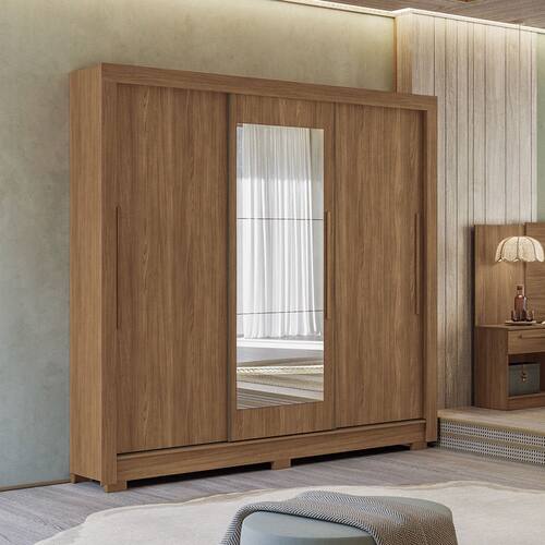 O guarda-roupa 03 portas de correr com espelho Maringa da Santos Andira e um movel de alta qualidade, beleza e funcionalidade. Seu design de 3 portas de correr e uma otima opcao para espacos mais ajustados, alem disso, possui 2 amplas gavetas internas com corredicas telescopicas para acomodar todos os pertences da familia. As portas deslizam sob trilhos de aluminio e possuem freios, para ajustar onde quer que a porta pare ao abrir, e os puxadores sao em MDF revestidos. Este guarda roupa ja vem acompanhado pelos pes em PVC, para a maior comodidade na hora da montagem, permitindo assim, a opcao do consumidor quando montar. Internamente, este movel possui varias prateleiras e tambem cabideiros em aluminio. Produzido dentro das normas de sustentabilidade, sem prejudicar o meio ambiente. O acabamento e um pintura fosca em todas as opcoes de cores. Uma excelente opcao de mobiliario para o seu quarto de casal.