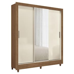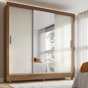 Guarda-roupa Casal 3 Portas De Correr Com Espelho Jequitiba/off White O Guarda-Roupa Franca 3 Portas de Correr com Espelho e ideal para quem busca praticidade, organizacao e estilo no quarto. Com portas de correr que economizam espaco e trilhos de aluminio que garantem deslizamento suave, ele combina funcionalidade e durabilidade. Possui espelhos centrais que ampliam o ambiente e trazem mais luminosidade, alem de puxadores em ABS com design clean e moderno. Suas gavetas com corredicas metalicas oferecem acesso pratico e suporte de ate 3kg cada, perfeitas para organizar roupas e acessorios. Uma escolha inteligente para deixar seu quarto mais funcional, elegante e bem organizado. Caracteristicas Estrutura: MDP 12 e 15mm e MDF 12mm Acabamento: Pintura UV Quantidade e Tipo de Portas: 3 de Correr Tipo de Trilhos: em Aluminio Quantidade de Gavetas: 2 Tipo de Corredicas: Metalicas Simples Tipo de Puxadores: Plastico ABS Quantidade e Tipo de Cabideiros: 3 em Aluminio Quantidade de Prateleiras: 4 Suporte ate: 5kg na prateleira e 3kg por gaveta. Manutencao: Nao limpar com alcool ou qualquer outro produto quimico, utilize somente pano seco ou levemente umedecido. Sistema de Montagem: Cavilhas, Parafusos e Minifix Itens Inclusos: 1 Guarda-Roupa, Kit ferragens e Manual de montagem Garantia de Fabrica: 3 meses