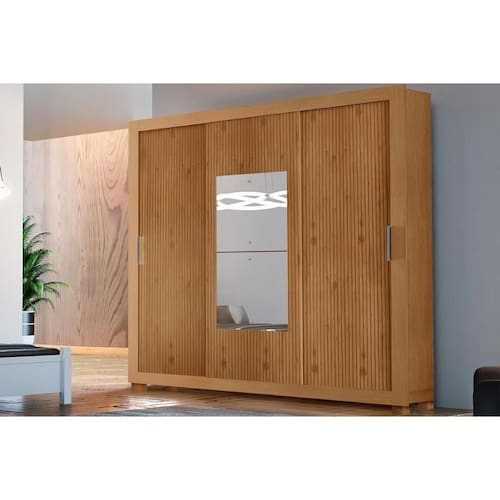Guarda Roupa Casal 3 Portas De Correr E 4 Gavetas C/ Espelho E Pés Veneza Premium Naturale-naturale Ripado 3d - Flex - Rufato