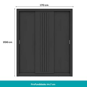 Tipo de Porta: Correr | Altura (cm): 206 cm | Portas: 3 | Profundidade (cm): 46 cm | Cor: Preto | Cor Via : Preto | Material para Filtro: Madeira | Estado de Origem: RS | Família da Cor: Preto | Gavetas: 0 | Peso do produto (Kg): 85,9 | Tamanho do Guarda-Roupas: Casal | Largura do produto (cm): 170 cm | Material: MDP | Tipo de Guarda Roupa: Casal | Altura do Produto com Embalagem (cm): 59,8 cm | Largura do Produto com Embalagem (cm): 210,8 cm | Comprimento do Produto com Embalagem (cm): 22,1 cm | Peso do Produto com Embalagem (kg): 90,20 Kg | Produto precisa de Montagem?: Sim, o produto é enviado desmontado e acompanha manual com instruções para a montagem. A empresa Móveis Carraro não realiza o de montagem. | Nome do Simples no Fornecedor: Guarda Roupa Casal 3 Portas Doha Carraro Preto Touch | Conteúdo da Embalagem: 1 Guarda Roupa Casal 3 Portas Doha Carraro Preto Touch - 3 VOLUMES | Descrição do Tamanho: Altura: 206 cm | Largura: 120 cm | Profundidade: 46,0 cm | batteries_required (Baterias são necessárias?): Não | PrazoExp: 2 | color (Cor): Preto | external_testing_certification (Certificação de teste externo): Não aplicável | included_components (Componentes incluídos): Não aplicável | is_assembly_required (Requer montagem?): Sim | is_fragile (É frágil?): Sim | item_depth_width_height (Dimensões do item profundidade, largura, altura): Altura: 206 cm | Largura: 120 cm | Profundidade: 46,0 cm | item_weight (Peso do item): 85,9 | manufacturer (Fabricante): Móveis Carraro | model_number ( do modelo): 1118332960 | number_of_boxes ( de caixas): 3 | number_of_items ( de itens no pacote): 1 | part_number ( da peça): Não aplicável | Principais Características do Produto (bullet_point#0): Guarda-Roupa | Principais Características do Produto (bullet_point#1): Portas Reversíveis | Principais Características do Produto (bullet_point#2): Casal