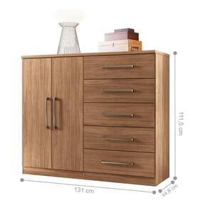 A Cômoda possui cinco gavetas com corrediças telescópicas possibilitando a abertura total da gaveta com deslizamento suave, preciso e resistente facilitando a organização das roupas.