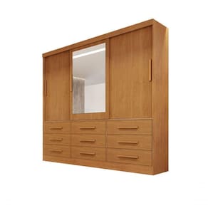 Esse guarda-roupa não pode faltar em sua casa! É um aliado na hora de organizar e deixar o cômodo com o toque pessoal. Ótimo espaço interno para guardar todos aqueles itens, seja o vestuário dobrado nas gavetas, peças delicadas nos cabideiros ou ainda roupas de camas, calçados e outros acessórios. Para fechar com chave de ouro, as portas de correr te ajudam a aproveitar muito melhor o espaço do ambiente e trazem um visual super elegante. Fabricado em MDP, estrutura de 15mm, possui 9 gavetas externas com corrediças telescópicas, puxadores de madeira, espelho com película de , costas inteiras, cabideiros em alumínmio. Acabamento semi brilho.