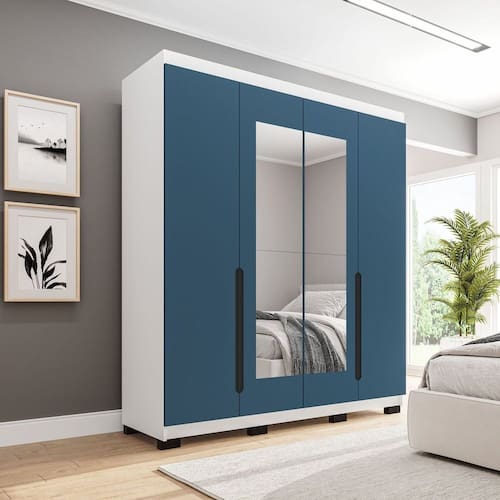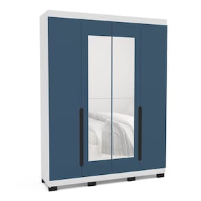 Guarda-roupa Casal 4 Portas com Espelho Madrid Azul/Branco
