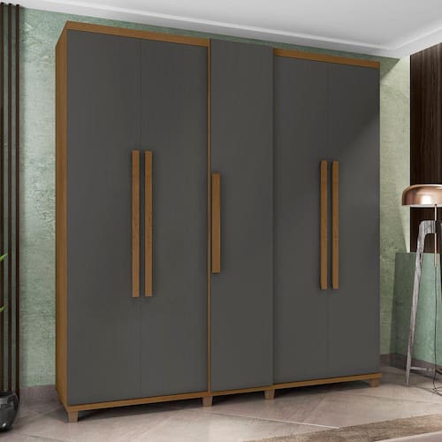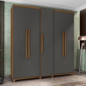 Cor: Cinamomo e grafite Linha: Quarto Modelo: Munique Tipo: Casal Material: MDF Material do cabideiro/calceiro: Alumínio Acabamento: Pintura UV Quantidade de pés: 8 Quantidade de portas: 5 Quantidade de gavetas: 3 Quantidade de prateleiras: 7 Quantidade de maleiros: 2 Quantidade de cabideiros: 2 Quantidade de calceiros: 1 Tipo de portas: Bater Tipo de corrediças: Telescópicas Tipo de dobradiças: Metálicas Necessita montagem: Sim Complexidade da montagem: Fácil Sistema de montagem: Buchas e parafusos Quantidade de volumes: 5