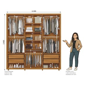 Suas portas com ripado angular trazem um visual moderno, enquanto os cabideiros extensíveis em alumínio otimizam o uso do espaço interno. A moldura envoltória de 2,5 cm confere um acabamento elegante, e as dobradiças de 3,5 cm com sistema de amortecimento garantem um movimento suave ao abrir e fechar.