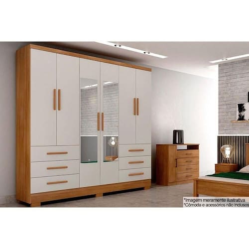 Material dos Cabideiros - Cabideira Metálico Tipo de Dobradiças - Dobradiças Metálicas Diferenciais das Portas - Porta c/ Espelho Quantidade de Portas - 6 Portas de Abrir Tipo de Corrediça - c/ Corrediças Telescópicas Quantidade de Gavetas - 6 Gavetas Tipo dos Pés - ABS/PVC Quantidade de Prateleiras - 5
