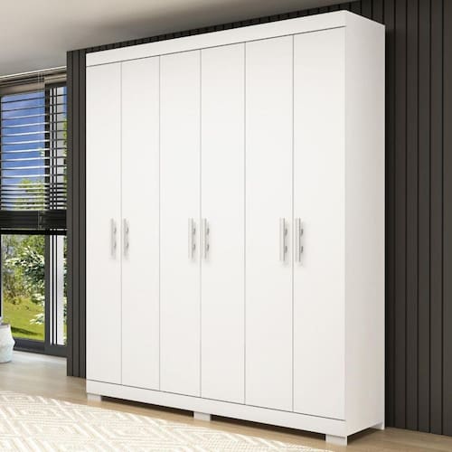 Renove o seu quarto com o Guarda Roupa Lana! Combinando estilo e funcionalidade, este móvel possui seis portas e duas gavetas, oferecendo um amplo espaço para manter suas roupas, calçados e acessórios organizados.