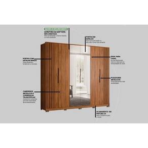 Tipo de Cabideiro - Aéreo Material dos Cabideiros - Cabideira Metálico Tipo de Porta do Guarda-Roupa - Portas de Bater Material das Portas - Portas em MDP Tipo de Dobradiças - Dobradiças Metálicas Diferenciais das Portas - Portas com Detalhe Ripado - Porta c/ Espelho Quantidade de Portas - 6 Portas de Abrir Quantidade de Portas com Espelho - 2 Portas com Espelho Tipo de Espelho - Espelho Externo Quantidade de Espelhos - 2 Material das Gavetas - Gavetas em MDP Tipo de Corrediça - c/ Corrediças Telescópicas Quantidade de Gavetas - 6 Gavetas Tipo dos Pés - ABS/PVC Quantidade de Pés - 10 Pés Material das Prateleiras - Prateleiras em MDP Quantidade de Prateleiras - 3 Quantidade de Nichos - 5 Nichos