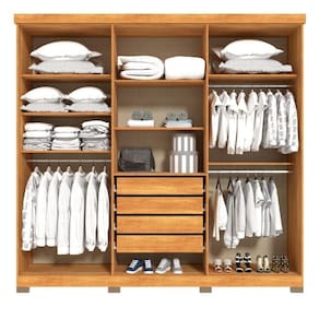 O modelo conta com prateleiras, cabideiros e nichos estrategicamente distribuídos para otimizar o armazenamento, mantendo tudo sempre acessível e bem organizado.