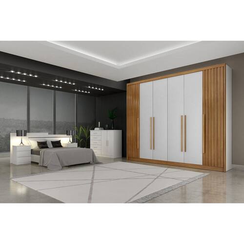 Particularidades do guarda-roupa: Características: - 100% MDF; - Colunado em 25mm; - Puxadores com acabamento amadeirado; - 6 Gavetas internas com puxadores; - Corrediças telescópicas; - Dobradiça de pressão de 35mm; - Fundo inteiriço; - Cabideiros em alumínio;