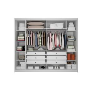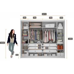 Particularidades do guarda-roupa: Características: - 100% MDF; - Colunado em 25mm; - Puxadores com acabamento amadeirado; - 6 Gavetas internas com puxadores; - Corrediças telescópicas; - Dobradiça de pressão de 35mm; - Fundo inteiriço; - Cabideiros em alumínio;