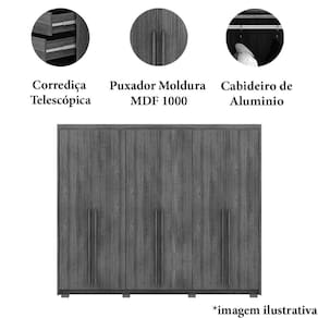 • Pintura: Frente de MDF 15mm de expessura, corpo de MDF 15mm de expessura, fundo de MDF 03mm de expessura, cabideiro de alumínio, puxador moldura mdf 1000, corrediça telescópica.