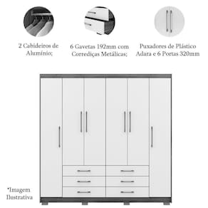 - Pintura: Possui 2 Cabideiros de Alumínio, Puxadores de Plástico Adara, Portas 320mm e Gavetas 192mm;