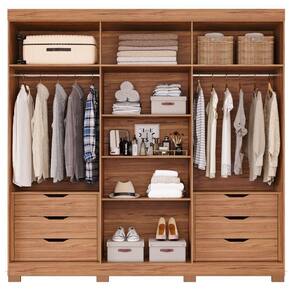 O guarda-roupa possui 6 gavetas espaçosas, ideais para a organização de roupas, acessórios e objetos pessoais. As gavetas apresentam corrediças telescópicas, o que permite um deslizar suave e facilita o acesso aos itens armazenados. Além disso, as gavetas possuem cava usinada na cor do produto, proporcionando um acabamento refinado e uniforme.