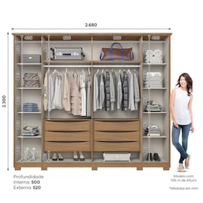 FICHA TÉCNICA: Medidas do Produto Montado -A x L x P-: 230 x 268 x 52 Cm Peso do Produto Montado -Kg-: 221 Kg O Produto Montado Suporta até -Kg-: 130 Kg Material Principal do Produto: MDP Acabamento Externo: Pintura UV Texturizada Acabamento Interno: Pintura UV Texturizada Escala de Brilho: Fosco Material do Fundo: MDF Possui Espaço para Vestidos Longos: Não Possui Ganchos: Não Possui Iluminação Led: Não Possui Maleiro: Sim Possui porta Objetos: Não Possui Nichos: Não Qtd. Portas: 6 Portas Tipo Porta: Bater Material da Porta: MDP Material da Dobradiça: Metálica 35mm com Amortecimento Material do Puxador Porta: Alumínio Qtd. Gavetas: 6 Gavetas Tipo de Gavetas: Interna Material da Gaveta: MDP Material da Corrediça: Telescópica Material do Puxador Gaveta: Possui Usinagem para Pega Peso Máximo por Gaveta: 3 Kg Possui Organizador de Gaveta: Não Qtd. Prateleiras: 8 Prateleiras Material da Prateleira: MDP Peso Máximo por Prateleira: 8 Kg Possui Pés/Rodapé: Sim Qtd. de Pés: 10 Pés Material Pés/Rodapé: MDP/ABS Altura Pés/Rodapés: Pés: 5 Cm; Rodapé: Pés/Rodapé Reguláveis: Não Possui Espelho: Sim Medida do Espelho -A x L x E-: 1053 x 439 x 3 Tipo de Fixação do Espelho: Parafusos Quantidade de Portas com Espelho: 2 Portas Formato do Espelho: Retangular Quantidade de Espelho: 4 Espelhos Possui Vidro: Não Material Principal: MDP Possui Espaço para Calçados: Sim Possui Cabideiro/Calceiro: Sim Qtd. de Cabideiro/Calceiro: 2 Und Material do Cabideiro/Calceiro: Alumínio Ean: 7890022170880
