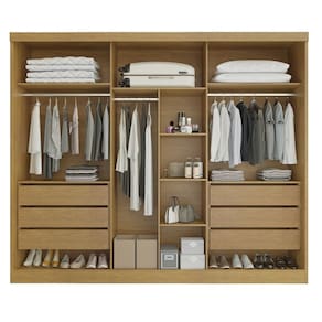 O guarda-roupa possui seis portas, o que permite fácil acesso ao seu interior. Cada porta possui um puxador discreto e elegante, contribuindo para o visual sofisticado do móvel. As portas são espaçosas e fornecem amplo espaço para pendurar roupas, como vestidos, camisas e casacos.