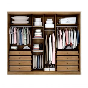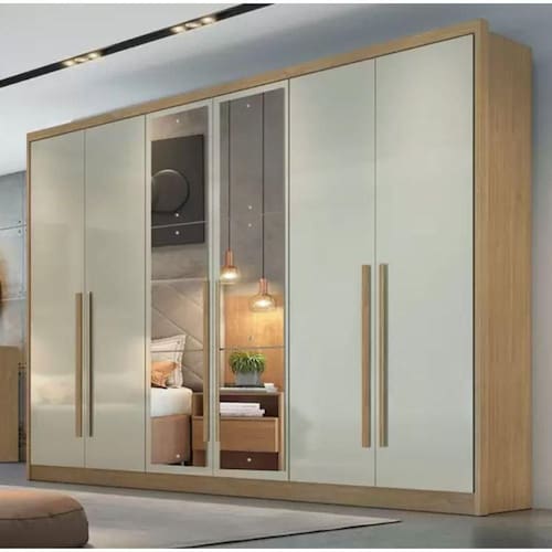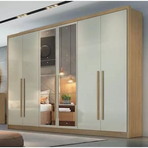 Particularidades do guarda-roupa: Características: -As bordas do produto acompanham a cor externa -Parte interna na mesma cor do produto -100% MDF -Puxadores com acabamento amadeirado -Colunado em 25mm -Interno ele e ela -Espaço para longo -Gavetas internas com puxadores -Dobradiças de pressão de 35mm -Corrediças telescópicas -Cabideiros e calceiros em alumínio -8 Gavetas