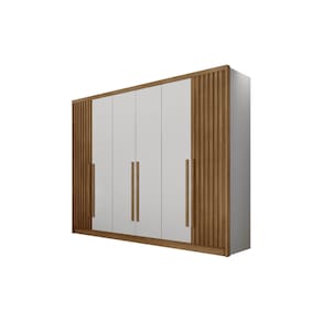 Particularidades do guarda-roupa: Características: - 100% MDF; - Maior profundidade; - Colunado em 25mm; - Portas com detalhe ripado; - Puxadores com acabamento amadeirado; - 8 Gavetas internas com puxadores; - Corrediças telescópicas; - Dobradiça de pressão de 35mm; - Duas opções de montagem de interno; - Cabideiros em alumínio;