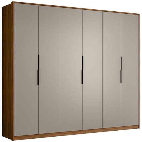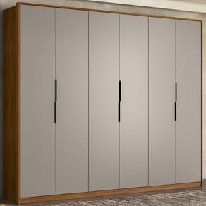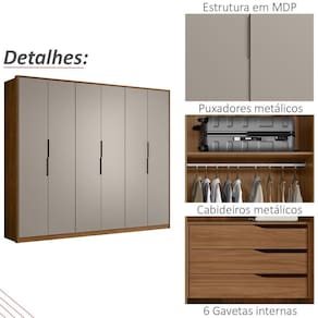 Guarda Roupa Casal 6 Portas Atrice, moderno e sofisticado, permite guardar muitas coisas e ainda ter locais separados para o casal. Estrutura em MDP de 12, 15 e 18 mm, e conta com pintura em acabamento UV (Fosco). Composto por 6 portas articuladas com dobradiças metálicas e longos puxadores em alumínio, as portas laterais dão acesso há 6 gavetas internas com corrediças telescópicas e detalhes curvos que dispensam puxadores, além disso, há um cabideiro metálico para roupas de até médio comprimento, um espaço para os sapatos e um maleiro para as roupas de cama, já nas portas centrais, há outro cabideiro metálico para roupas longas, 4 prateleiras ótimas para roupas dobradas ou toalhas, e mais um maleiro. Além de ampla capacidade de armazenamento, foi desenvolvido para oferecer total conforto e comodidade para você. Este móvel chegará na sua casa separado em 6 volumes.