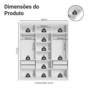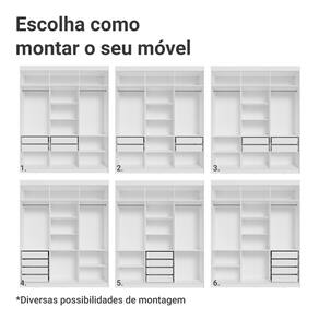 As portas fecham de forma suave e silenciosa, por possuir dobradiças com amortecimento. As gavetas permitem uma abertura completa e o amplo maleiro é perfeito para armazenar itens maiores. O interior do guarda-roupa pode ser personalizado, com a possibilidade de ajustar as gavetas e prateleiras conforme suas necessidades.