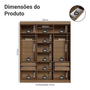 As portas fecham de forma suave e silenciosa, por possuir dobradiças com amortecimento. As gavetas permitem uma abertura completa e o amplo maleiro é perfeito para armazenar itens maiores. O interior do guarda-roupa pode ser personalizado, com a possibilidade de ajustar as gavetas e prateleiras conforme suas necessidades. Além disso, as portas do meio possuem espelho, agregando ainda mais funcionalidade ao móvel.