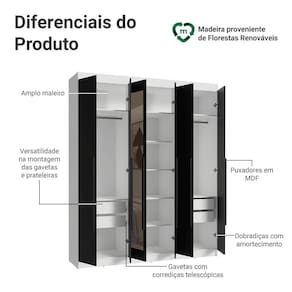 Possui uma pintura de alta resistência, que garante durabilidade e um acabamento impecável por muito mais tempo. A estrutura é na cor Branca, as portas e os puxadores são na cor preta, criando um visual sofisticado que se adapta a qualquer estilo de decoração. Os puxadores de 80 cm, fabricados em MDF, são um dos grandes diferenciais, trazendo um design alongado e moderno.