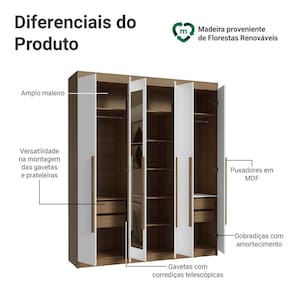 As portas fecham de forma suave e silenciosa, por possuir dobradiças com amortecimento. As gavetas permitem uma abertura completa e o amplo maleiro é perfeito para armazenar itens maiores. O interior do guarda-roupa pode ser personalizado, com a possibilidade de ajustar as gavetas e prateleiras conforme suas necessidades. Além disso, as portas do meio possuem espelho, agregando ainda mais funcionalidade ao móvel.