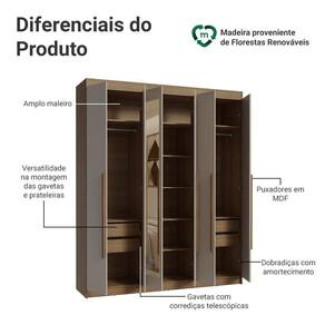 As portas fecham de forma suave e silenciosa, por possuir dobradiças com amortecimento. As gavetas permitem uma abertura completa e o amplo maleiro é perfeito para armazenar itens maiores. O interior do guarda-roupa pode ser personalizado, com a possibilidade de ajustar as gavetas e prateleiras conforme suas necessidades. Além disso, as portas do meio possuem espelho, agregando ainda mais funcionalidade ao móvel.