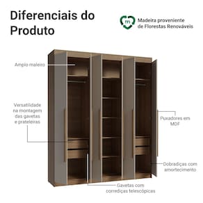 O Guarda-Roupa Venus oferece versatilidade para organizar seu espaço da melhor forma. Com dobradiças com amortecimento, as portas fecham suavemente. As gavetas com corrediças telescópicas permitem abertura total, enquanto o amplo maleiro é perfeito para itens maiores. Além disso, você pode ajustar as gavetas e prateleiras para personalizar o interior conforme suas necessidades.