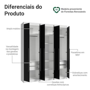 Possui uma pintura de alta resistência, que garante durabilidade e um acabamento impecável por muito mais tempo. A estrutura é na cor Branca, as frentes e puxadores em Preto. Os puxadores de 80 cm, fabricados em MDF, são um dos grandes diferenciais, trazendo um design alongado e moderno.