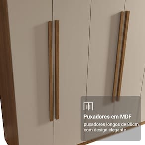 Possui uma pintura de alta resistência, que garante durabilidade e um acabamento impecável por muito mais tempo. A estrutura e os puxadores são em tom amadeirado Rustic e as portas na cor Crema, criando um visual sofisticado que se adapta a qualquer estilo de decoração. Os puxadores de 80 cm, fabricados em MDF, são um dos grandes diferenciais, trazendo um design alongado e moderno.