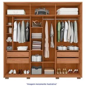Características: Marca: Caemmun Modelo: Cleo Tipo: Casal Tipo de portas: Bater Quantidade de portas: 6 portas Quantidade de gavetas: 4 gavetas Quantidade de cabideiros: 3 cabideiros Sapateira: 2 sapateiras Espelho: Não Tipo de dobradiças: Metálicas Tipo de dobradiças: Telescópicas Material da estrutura: MDF Pés: Sim Sistema de montagem: Parafusos e cavilhas