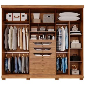 Espaço e organização de sobra Precisa de espaço? O roupeiro Guarapari é ideal para você. Ele conta com várias divisórias, como os quatro cabideiros, sendo dois para roupas longas. Além disso, o roupeiro traz seis lindas gavetas com corrediças telescópicas. E tudo produzido em MDF de alta qualidade.