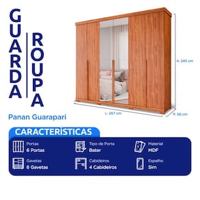 Características: Marca: Panan Modelo: Guarapari Tipo: Casal Tipo de porta: Bater Quantidade de portas: 6 portas Quantidade de gavetas: 6 gavetas Quantidade de cabideiros: 4 cabideiros Sapateira: Não Espelho: Sim Gaveta com chave: Não Tipo de corrediças: Telescópicas Material da estrutura: MDF Material dos puxadores: MDF Pés: Sim Material dos pés: ABS Acabamento: Pintura UV Sistema de montagem: Cavilhas e parafusos