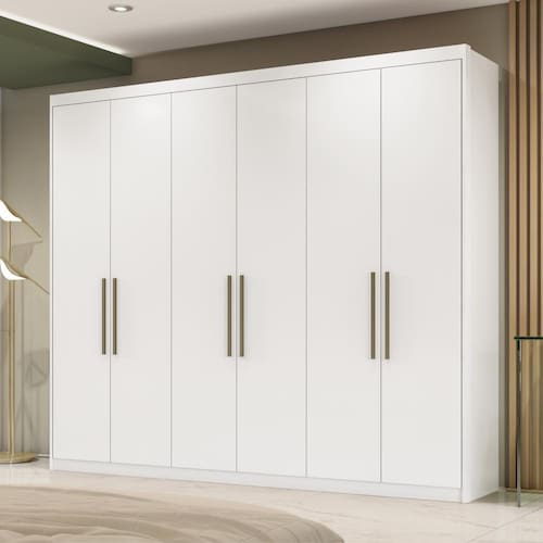 Possui 6 portas de abrir e 3 gavetas todas com corrediças telescópicas e profundidade adequada para roupas e sapatos