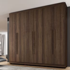 Guarda Roupa Casal 6 Portas com Pes New Master Benetil O Roupeiro New Master 6 Portas e a escolha ideal para quem precisa de espaco sem abrir mao do estilo. Fabricado em chapa de MDP 15 mm, oferece resistencia superior e maior durabilidade, sendo perfeito para o uso diario. Com 6 portas, 10 prateleiras bem distribuidas e nichos funcionais, ele garante um excelente aproveitamento interno, permitindo organizar roupas, acessorios e calcados com muito mais funcionalidade. Com 4 gavetas espacosas, equipadas com corredicas telescopicas que proporcionam abertura suave e maior resistencia, suportando uso continuo com eficiencia.